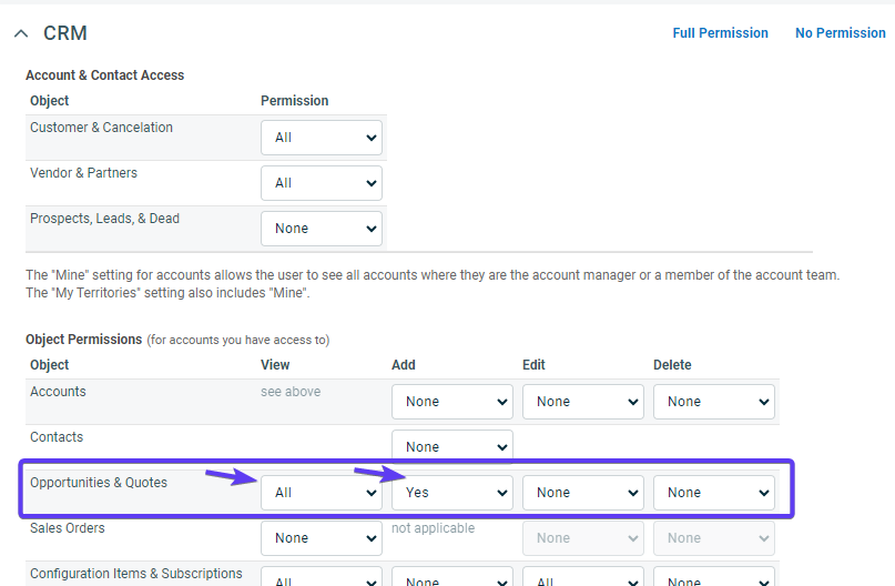 Expand CRM and set the values as outlined below for Opportunities and Quotes.