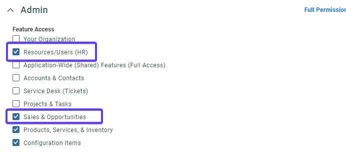 Expand Admin - and check Resource/Users (HR) and Sales & Opportunities. Note, we need access to Resources/HR to assign an Opportunity Owner if creating an Opportunity.