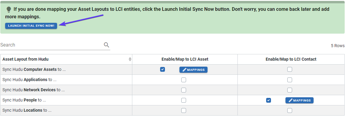 7. Once you have enabled at least one Hudu Asset Layout to either LCI Asset or LCI Contact, you will be permitted to launch your Initial Sync with Hudu. To launch, click the button Launch Initial Sync Now! button.