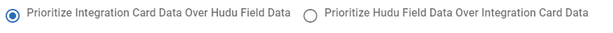 Prioritization matters if Hudu has collected data from both a third party integration (Integration Card in Hudu), and also has data entered into a Hudu custom field. By default the Integration data will be loaded into LCI. If you want the Hudu Custom Field data to be loaded if both exist, then you would select 'Prioritize Hudu Field Data Over Integration Card Data'.