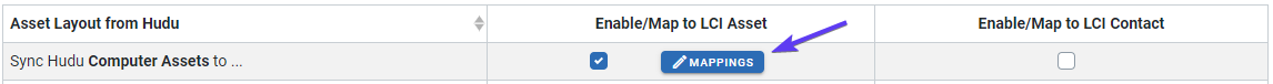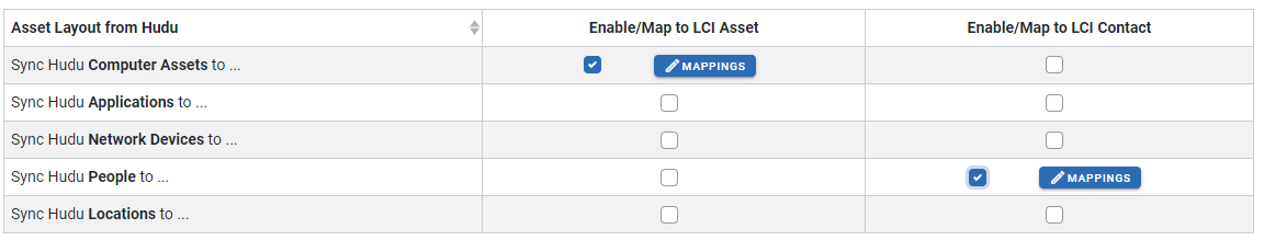 - You will map your Hudu Asset Layouts to LCI Assets and Contacts