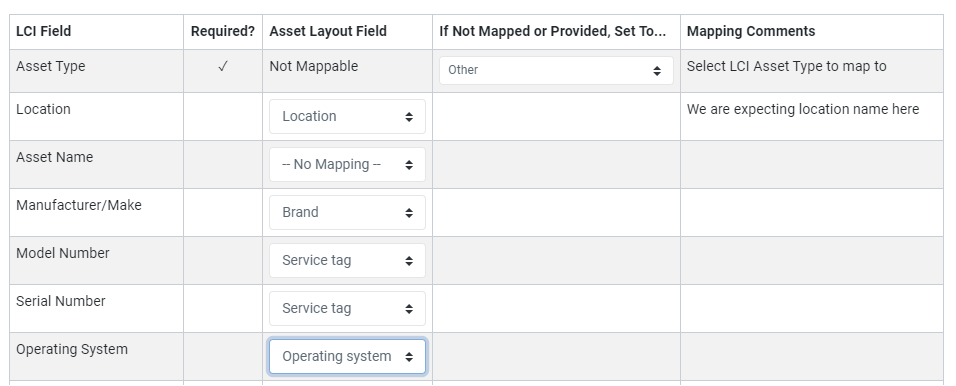 In this dialog, we will show a list of LCI data fields that can be mapped. For each LCI data field, you may select a Hudu Asset Layout field to map to it.