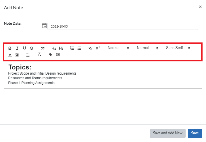 Select a note date and enter the note in the provided text box. Use the text tools to enhance your notes.