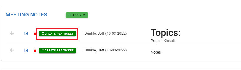 You can create a PSA ticket from your meeting notes by clicking the Create Ticket icon next to the corresponding note in the notes listing.