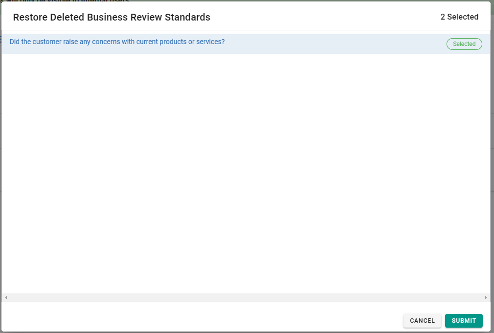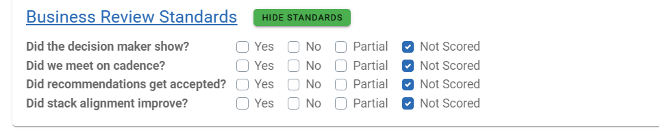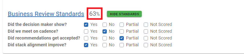 Standards scoring is comprised of a set of questions that you can develop to assess the success of the business review. When you or your account managers complete a business review meeting the questions are answered and a success score is assigned to the business review. These scores can then be used as a configured health metric in the Customer Success modal.