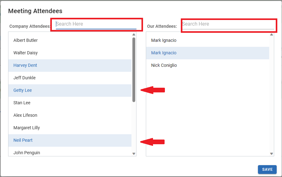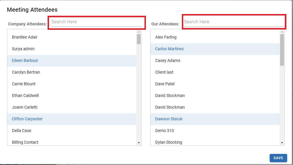 Select attendees from the client list (left pane) and the company list (right pane) by selecting each attendee from the list or use the search bar feature to narrow your lists for easier use. Click Save to save changes and exit the attendee window.