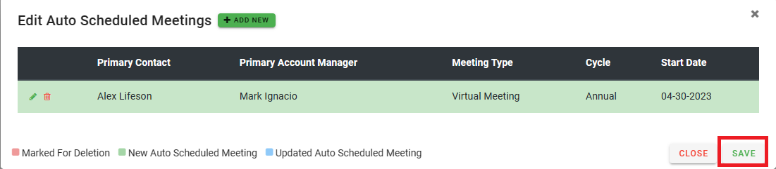 The schedule window will now display the auto scheduled meetings for your client. A legend will display the status of the listed meetings on the schedule. You must click the Save button at the bottom of the window to save all new meetings and any meeting edits.