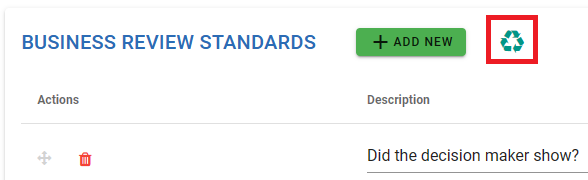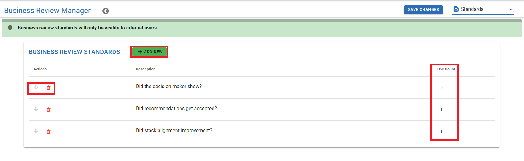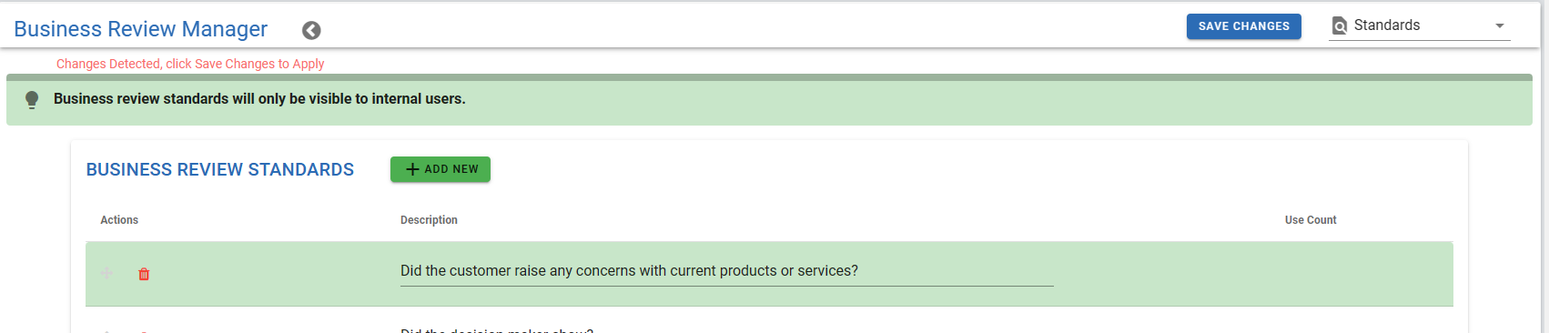 The Standards page will list all current standard, along with their use count within the Business Reviews.