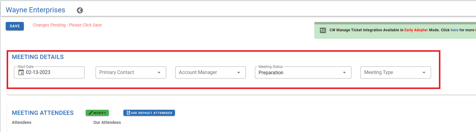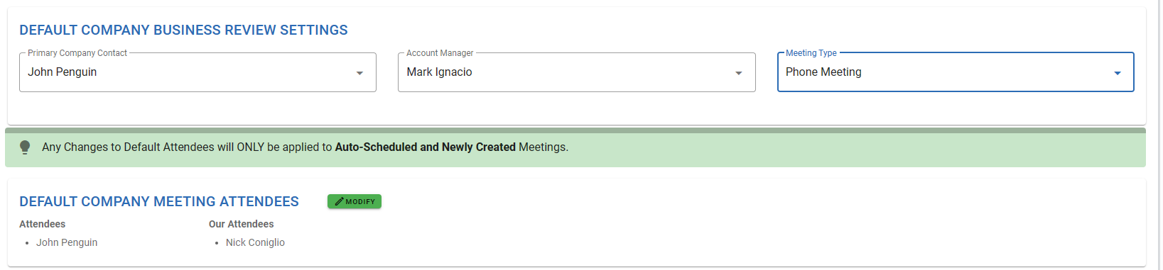 Set the default meeting attendees by clicking the Modify button in the Company Attendees section of the page.