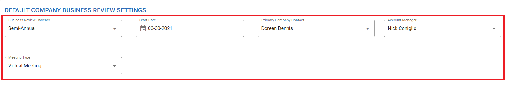 Use the drop down selectors to set a default primary contact, Account Manager, and Meeting type.