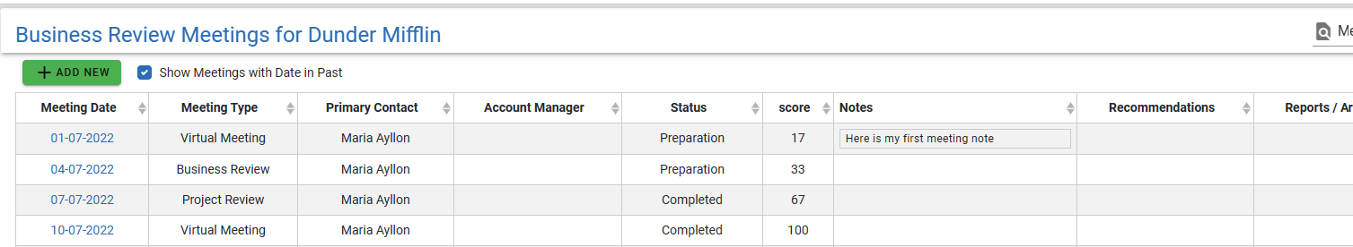 Use the drop-down selectors to select the Date, Primary Contact, Account Manager, Meeting Status, and Meeting Type.