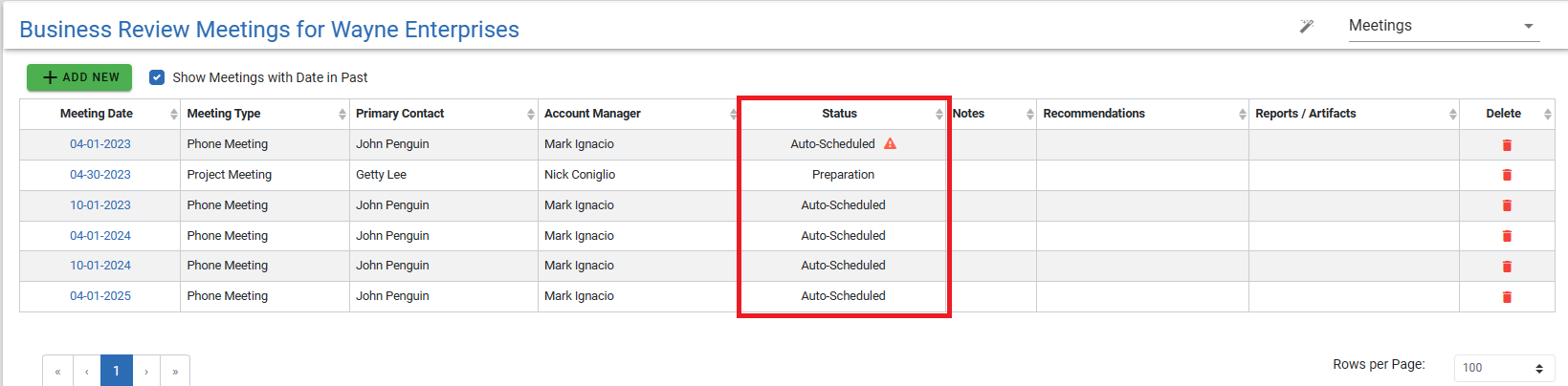 Scheduled meetings will show in the Business Review table with the status of Auto Scheduled. The