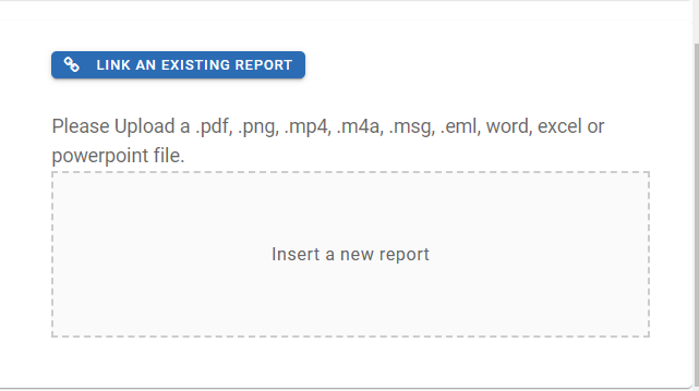 You can upload PDF files, MS Word (Docx) files, MS Powerpoint (.ppt) files, Email (.msg, .eml) files, MS Excel (.xls, .xlsm) files, and Image (.png) files.