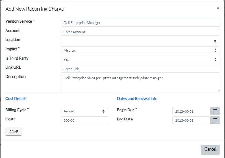 Enter Recurring Charge information and click the Save button