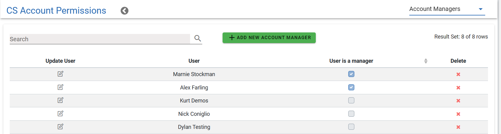 The Account Manager page displays a list of currently assigned account managers. Account Managers can be assigned Customer Success access to specific companies. You can also assign account managers to specific account groups.