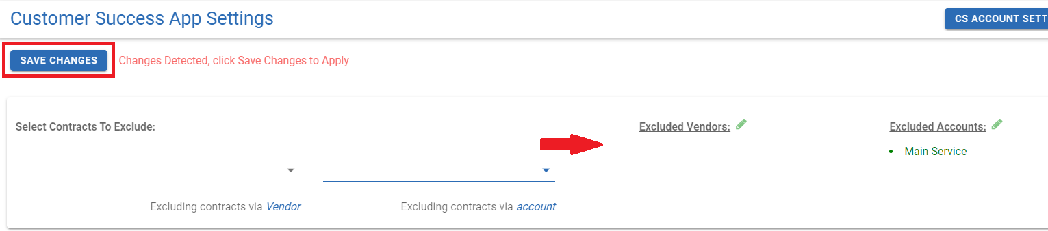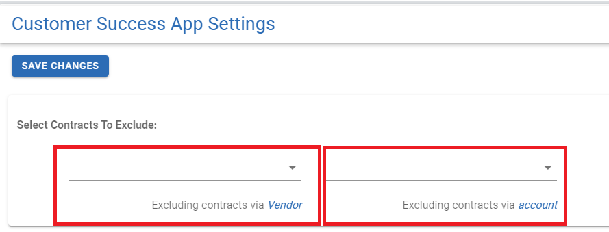 The App Settings page contains a drop-down list to exclude contracts by vendor and a second drop-down list to exclude contracts by account. Use either list to select contracts to exclude
