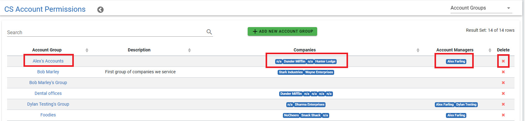 Click the account group name to edit the group settings, or the delete icon to remove the account group.