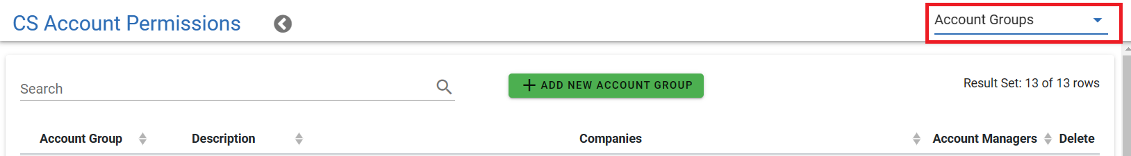 The Account Group, Company Groups, and Account Manager pages can be accessed via the drop-down selector located in the upper right corner of the page.