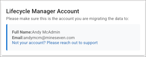 Note: At the top of the Data Migration page, the Lifecycle Manager admin account associated with the currently logged-in user is displayed. Ensure the account shown is the one associated with the Lifecycle Manager account you want to migrate data to. |